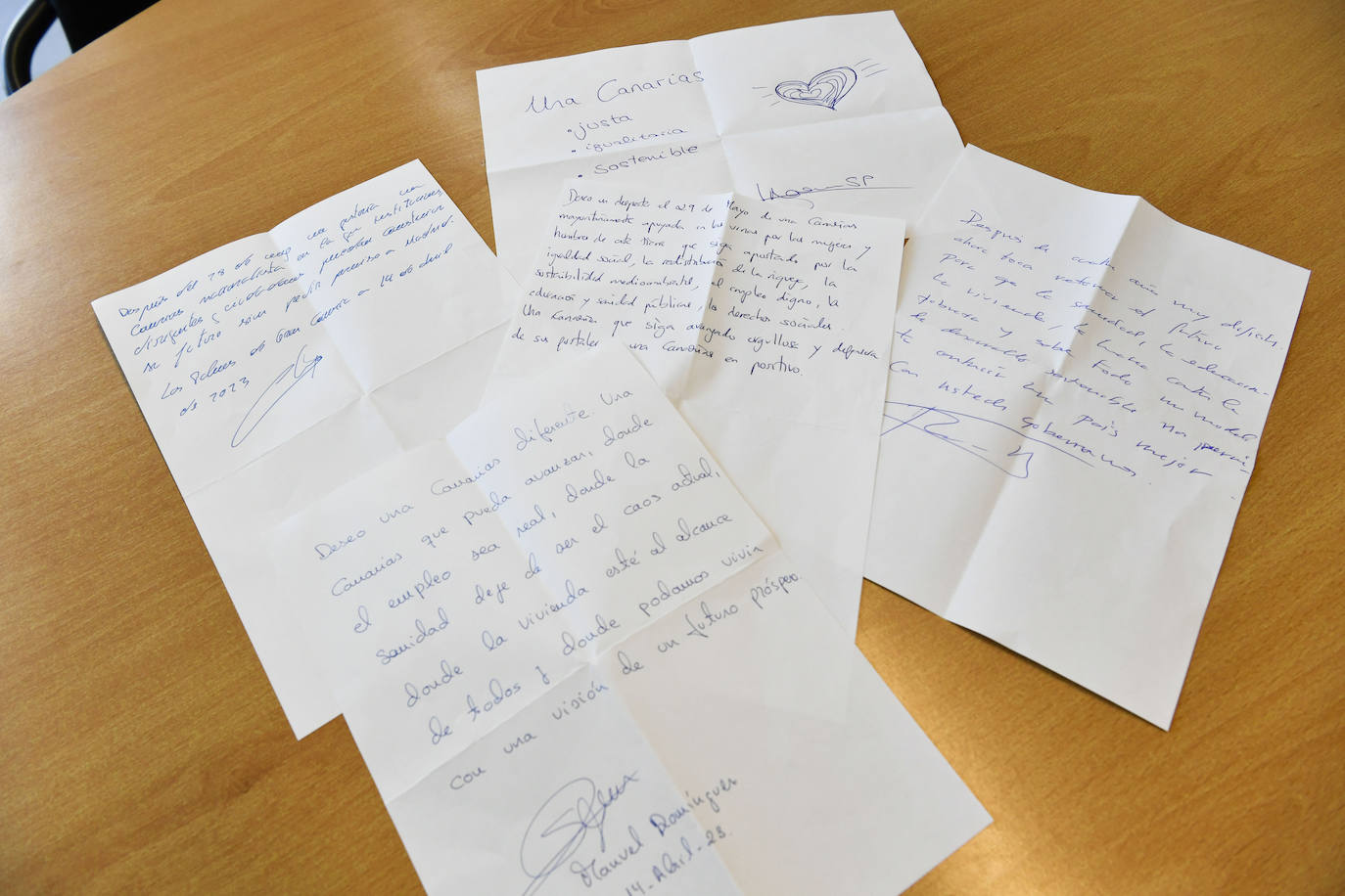 Como si fuera una de esas cápsulas del tiempo que se colocan en el acto de la primera piedra de un edificio pensando que siglos después alguien va a desentrañar el secreto, el día que acudieron a CANARIAS7 los candidatos a la Presidencia y a la Alcaldía de la capital grancanaria para una sesión gráfica conjunta, se les pidió que escribieran de su puño y letra su particular carta de los deseos para el 29 de mayo, esto es, para el día después de las elecciones.