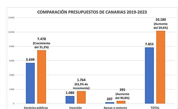 El crecimiento del último presupuesto de la legislatura con relación al inicial de 2019 es del 29,6%, pasando de los 7.855 millones de euros de entonces a los 10.180 millones para el próximo ejercicio. Los servicios públicos se incrementan un 31,2%; el año 2023 dispondrán de 7.478 millones para educación, sanidad o derechos sociales, frente a los 5.699 del último gobierno de CC. Dedicamos tanto a políticas sociales en 2023 como aquel ejecutivo lo hizo al total del Presupuesto en 2019.