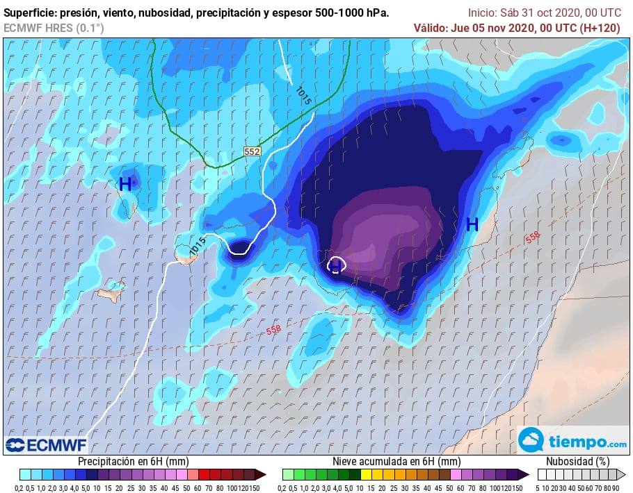 Octubre se despide con calor y calima mientras que noviembre se abre paso con precipitaciones que se extenderán por el sur de la Península y llegarán a las islas el miércoles. Se refleja, sin embargo, cierta incertidumbre en las previsiones de la Agencia Estatal de Meteorología (Aemet) sobre su intensidad y las zonas a la que afectará debido a la distancia del fenómeno en el tiempo, pero todo apunta a que barrerá el archipiélago de oeste a este y será más abundante en las zonas montañosas.
