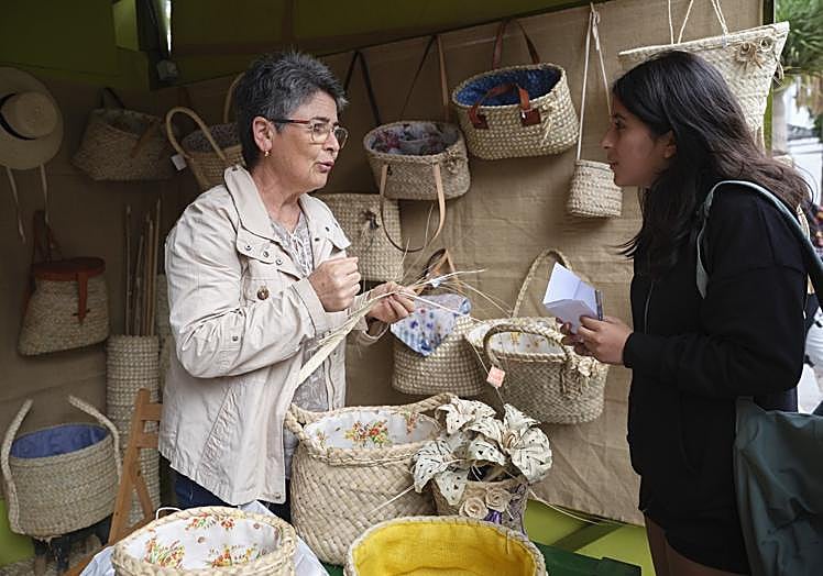 María (Pájara, 1964) atiende trenzando empleitas en su expositor de la 34º Feria Insular de Artesanía que organizan el Ayuntamiento de Antigua y la Fundación Colectivo Mafasca. A las formas tradicionales de sombreros de campesinos, serones (sacos para guardar grano), jenas (mochilas para ir a pescar) o esteras (alfombras), ha añadido cestas más modernas forradas en telas y con asas de cuero, mochilas, salvamanteles, flores delicadas que huelen a palma, macetas, pulseras.