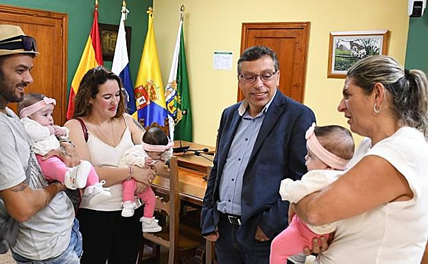 Alaïa, Alyssa y Astrid son las primeras trillizas que han nacido en Valsequillo. Nacieron el pasado 28 de abril con poco más de 26 semanas, siete meses después, han estado en el Ayuntamiento de Valsequillo donde el alcalde de la localidad, Francisco Atta y la concejala, Natalia Ramírez, han felicitado a esta familia numerosa de la localidad.