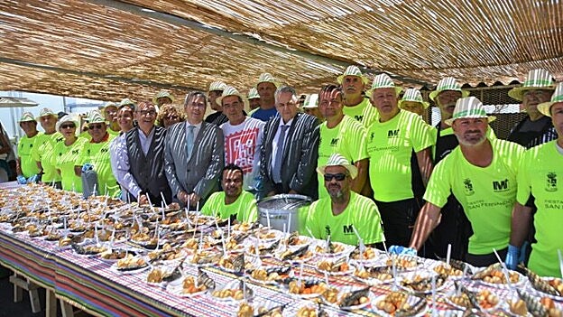 En las distintas tareas de preparar el condumio, como siempre desde que se iniciaran las Fiestas de San Fernando hace ya cerca de 40 años, una tropa de treinta amigos vecinos y vecinas del pueblo comandados por Aniceto Pérez Franco, luciendo en esta edición una camiseta identificativa nueva, con el nuevo logotipo turístico promocional de Maspalomas.