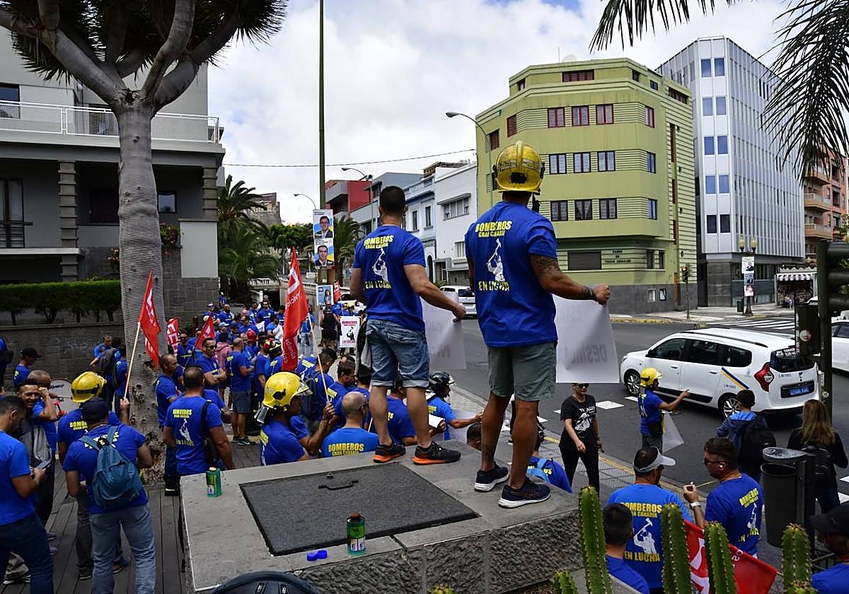 Los bomberos del Consorcio de Emergencias de Gran Canaria se concentraron en la mañana de este miércoles ante la sede del Cabildo para denunciar el bloqueo de las negociaciones para la renovación del acuerdo de condiciones laborales. En torno a 120 agentes de los 230 que tiene el cuerpo que cubre las emergencias en 19 de los 21 municipios de la isla participaron en la protesta, sonora y colorida, frente a la Casa Palacio.
