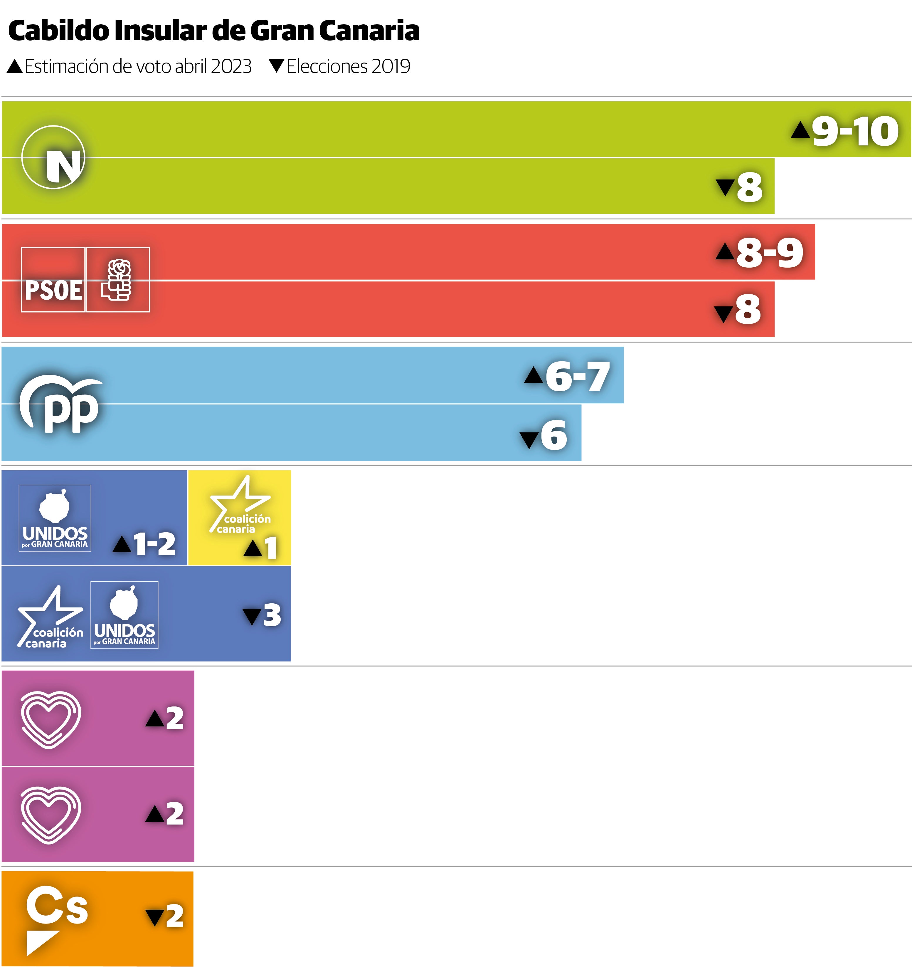 Este 28M UxGC y CC se presentan por separado, con José María Ponce y María Fernández, respectivamente, liderando sus listas, y esta separación puede pasarles factura. El sondeo apunta que los tres consejeros que obtuvieron juntos en 2019 podrían reducirse a uno solo, el que la encuesta asegura a UxGC, que se mueve en una horquilla de entre una y dos actas, mientras que CC baila sobre la delgada línea que supone superar o no la barrera mínima del 5% de votos válidos para conseguir una.