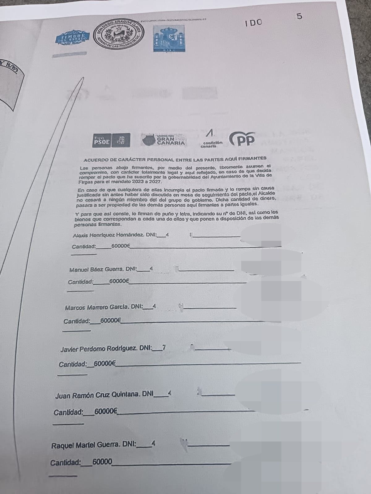 En el documento se estipula que los siete ediles que lo firman, incluido el alcalde, Alexis Henríquez, «libremente asumen el compromiso, con carácter totalmente legal», que si cualquier incumpliese el pacto de gobernabilidad y lo rompe sin causa justificada, sin pasar por la mesa de seguimiento, no se le cesará, sino que esa cantidad, los 60.000 euros, «pasará a ser propiedad de las demás personas aquí firmantes a partes iguales».