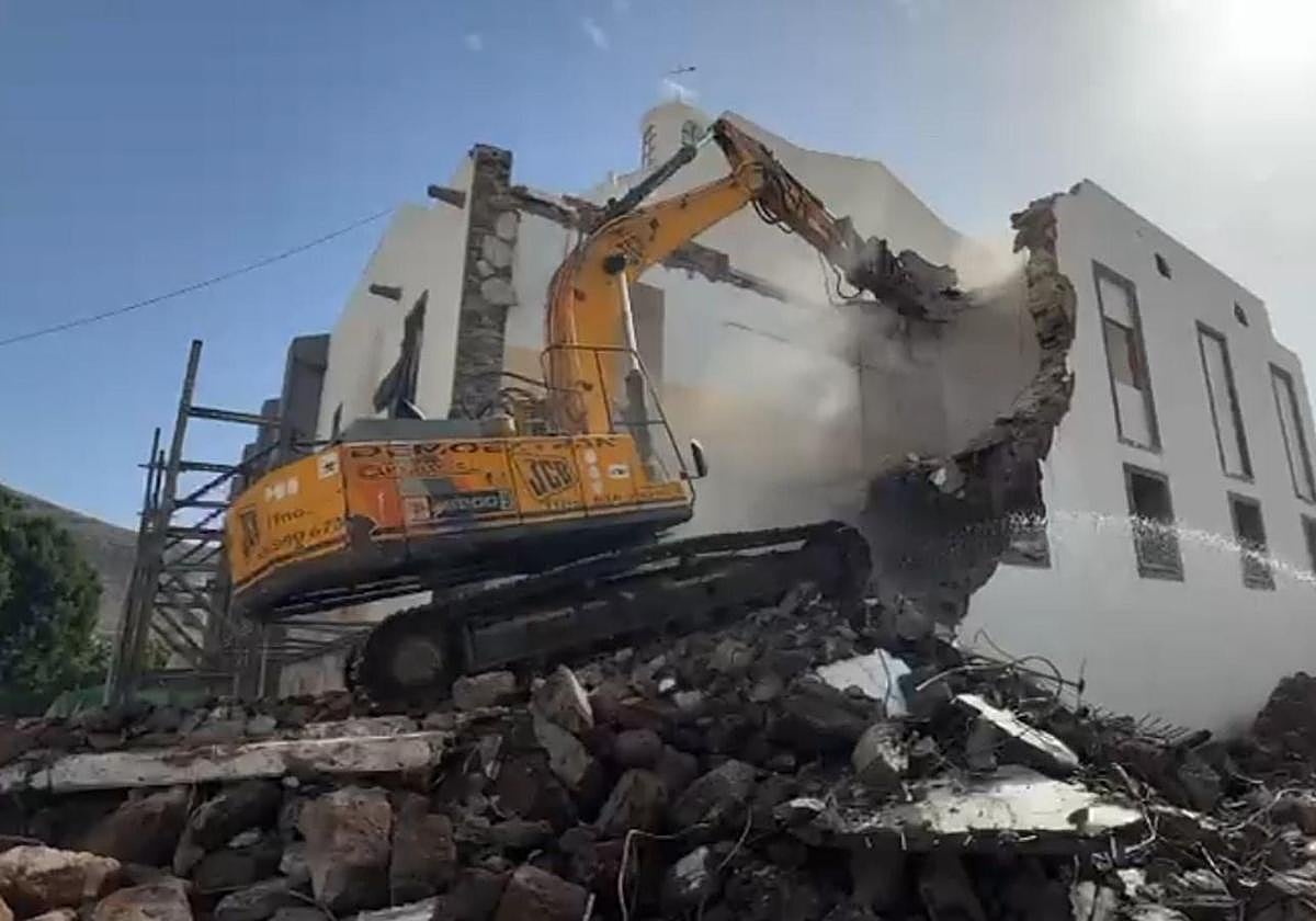Antes de proceder al derribo, se realizó semanas atrás un corte vertical que separaba físicamente el templo de la edificación trasera. La demolición se está ejecutando de manera controlada para evitar vibraciones que puedan afectar a la estructura de la iglesia o provocar nuevas grietas.