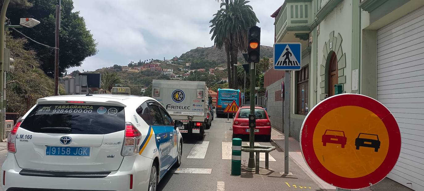 El cierre de uno de los dos carriles de la carretera del centro, GC15, para el soterrado de las canalizaciones por la construcción de la nueva glorieta de acceso a Santa Brígida está ocasionando largas retenciones, que ayer comenzaba desde La Atalaya.