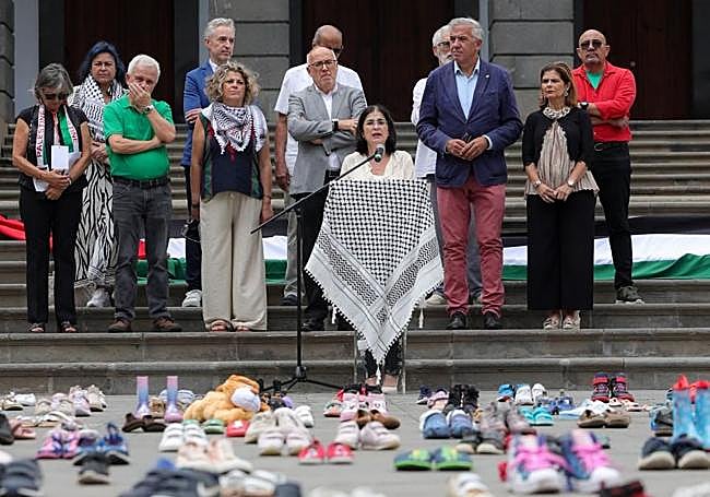 Darias, la primera en intervenir este lunes en el acto en recuerdo de los menores asesinados en Gaza, empezó su discurso con el foco puesto en la potente carga simbólica de los calzados desplegados por la plaza. «Nunca pensé que este espacio albergara tantos zapatos sin pies que calzar, como tantos cuerpos sin vida que están aniquilando en Gaza», lamentó la alcaldesa.