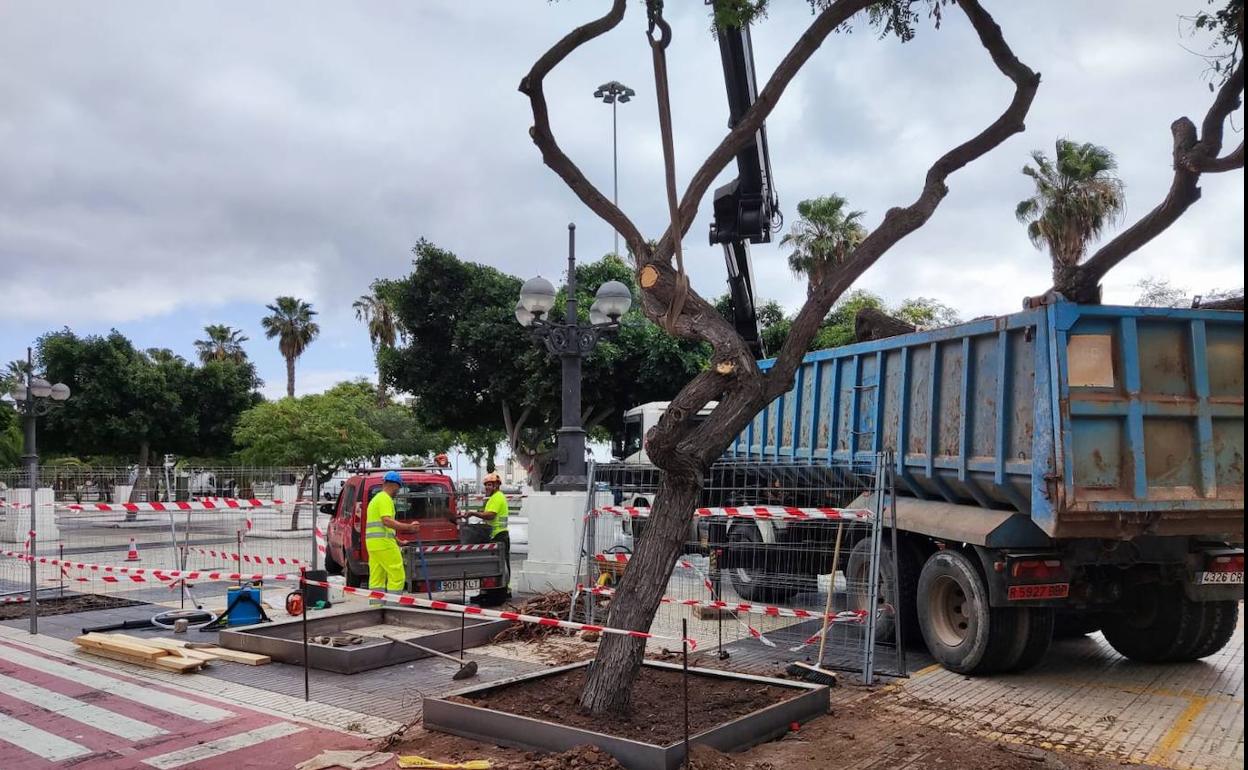 El Ayuntamiento de Las Palmas de Gran Canaria ha iniciado este lunes el trasplante de 46 árboles que se encuentran en el parque blanco y cuyo emplazamiento actual está afectado por las obras de construcción de la estación subterránea de Santa Catalina de la metroguagua.