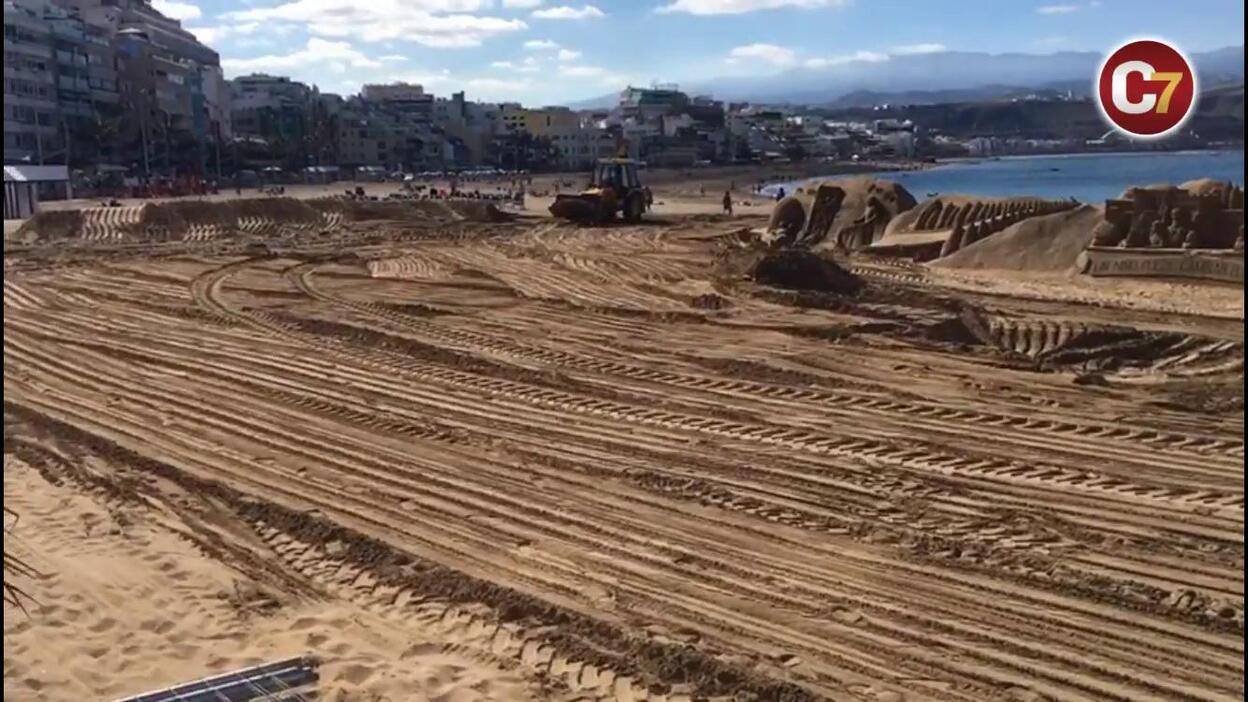 Las máquinas municipales hicieron acto de presencia en Las Canteras para acondicionar la playa y decir adiós a los últimos espacios decorativos navideños que quedaban en pie, entre ellos el genuino Belén de Arena, que en estas fechas ha batido un nuevo récord con 243.000 visitantes, además de recaudar 25.000 euros en total -7.000 euros más que en la Navidad pasada- que irán destinados a cuatro comedores sociales de la capital.