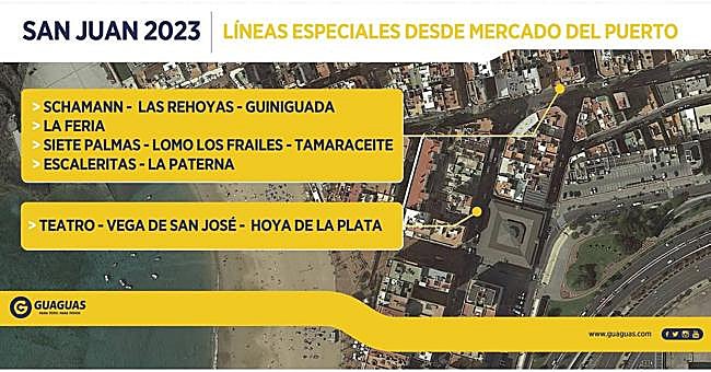 El servicio especial de Guaguas Municipales con motivo de los Fuegos de San Juan se dividirá en dos fases, con una primera que incluye refuerzos en las líneas con destino al área Puerto/Canteras y una segunda parte con cinco trayectos especiales a diferentes zonas de la ciudad que se activarán una vez finalizada la quema de los fuegos artificiales.