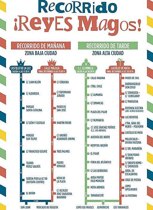Así, el intinerario real tendrá como punto de partida el Castillo de La Luz y recorrerá las calles Juan Rejón, Albareda, Parque Santa Catalina, León y Castillo, Parque San Telmo y Francisco Gourié para llegar al Teatro Pérez Galdós y subir por la autovía del centro (GC 110) hasta la rotonda de El Batán. Tras recorrer El Batán, la comitiva bajará por la GC 110 para visitar el barrio de San Juan. Volverá a tomar la autovía del centro para incorporarse a la Avenida Marítima por el Mercado de Vegueta, Alcalde Díaz Saavedra Navarro llegar hasta Hoya de la Plata y entrar por Pedro Hidalgo. En Tres Palmas subirá hasta la calle Andrés Alvarado Janina. Posteriormente, cogerá dirección al Martín Freire y al Paseo de San José. Bajará por Eufemiano Jurado hasta la calle Córdoba para finalizar la jornada matinal en la calle Málaga.