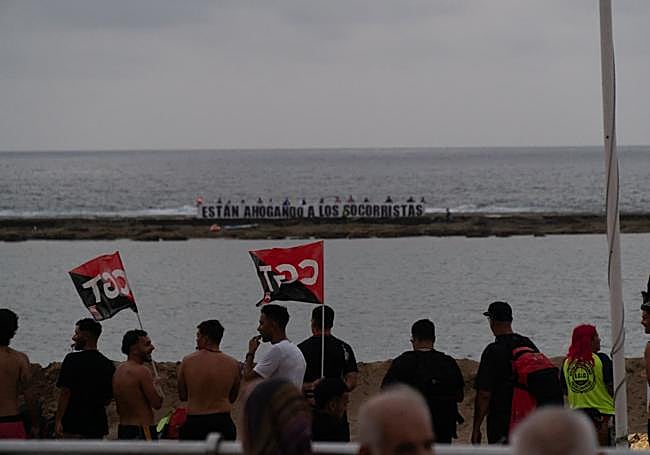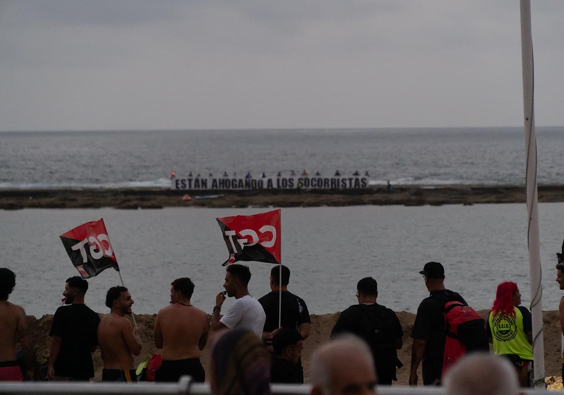 Noveno día de huelga protagonizada por los socorristas que alzaron la voz para reclamar unas condiciones laborales más dignas. Bajo el sol y entre turistas, los profesionales responsables de velar por la seguridad en la Playa de Las Canteras se plantaron en La Barra,donde desplegaron un cartel de protesta:«Están ahogando a los socorristas». Alegan que «su trabajo, esencial y de alto riesgo», no está siendo valorado ni remunerado de forma justa.