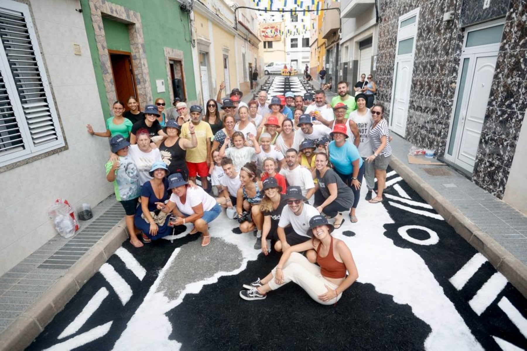 Juan Carlos Gil, peninsular y casado con una hija de La Isleta (Las Palmas de Gran Canaria), ultima con sal la decoración que remata el perímetro de una alfombra en un tramo de la calle Menceyes. «No soy de aquí, pero llevo más de 20 años participando, te acabas involucrando por cómo se vive esta fiesta». Se le escucha a duras penas. La música está alta. Son las cinco de la tarde de un sábado, pero el barrio bulle de vida. El pueblo entero se bate el cobre para estar a la altura el día de Ella, que es como conocen a la patrona, a la Virgen del Carmen. Las calles se visten de sal, caucho, arena y colores para la procesión terrestre más esperada, la de este domingo.