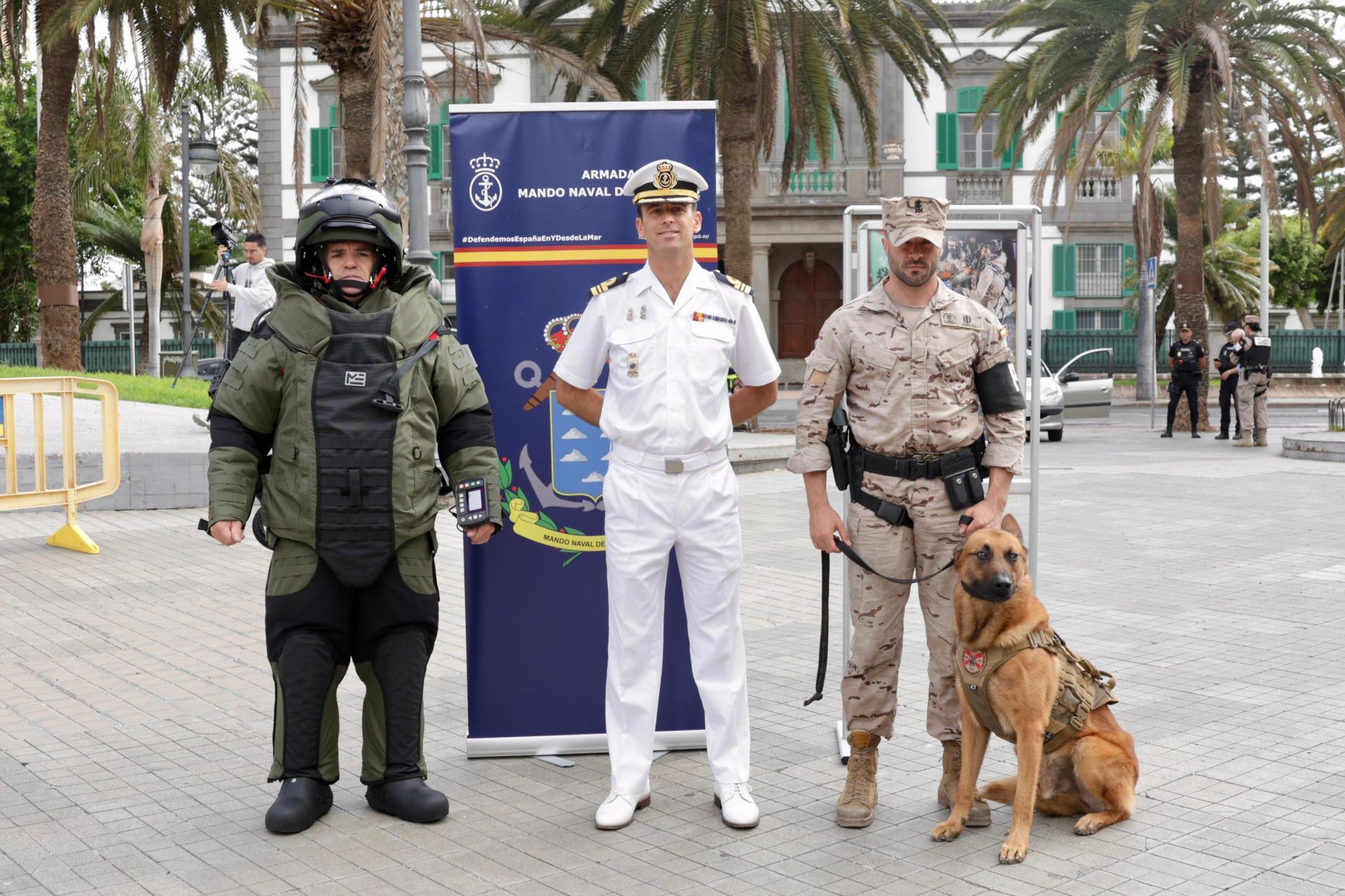 El evento subirá de intensidad a las 12:30 horas con una exhibición dinámica en la plaza. Aquí, los canarios podrán ver en acción a un equipo operativo de Infantería de Marina acompañado de su unidad canina, además de los buceadores especializados en desactivación de explosivos, que mostrarán técnicas de seguridad que normalmente se reservan solo para los profesionales. Será un espectáculo que mezcla disciplina, adrenalina y mucho trabajo en equipo.