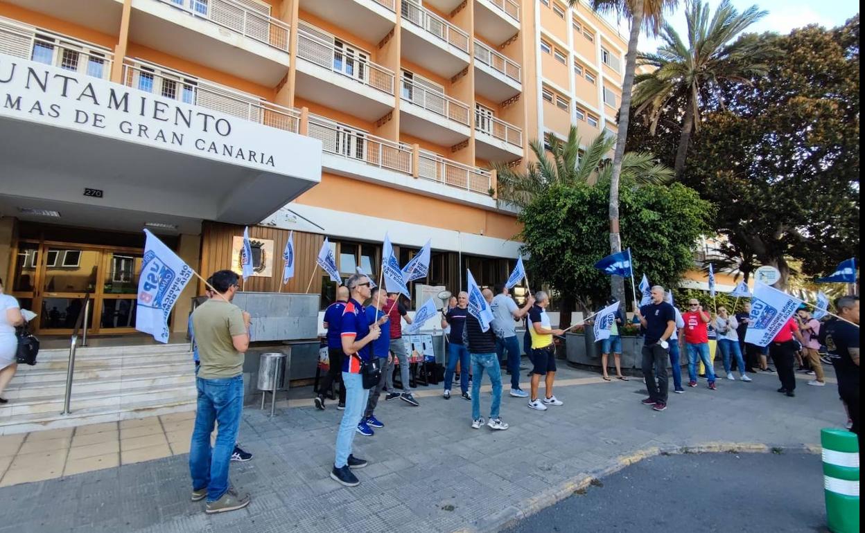 Representantes de policías y bomberos de Las Palmas de Gran Canaria se han manifestado este jueves a las puertas del ayuntamiento para exigir al grupo de gobierno el pago de un millón y medio de euros en horas extras realizadas y no abonadas.