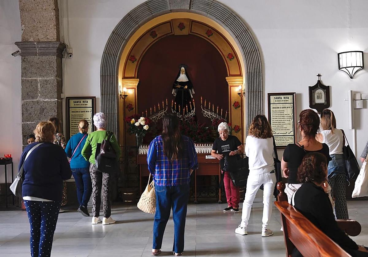 La parroquia Matriz de San Agustín, en el corazón del barrio histórico de Vegueta, fue este miércoles visita obligada para los devotos de Santa Rita. Como cada 22 de mayo, día de su festividad, los fieles acudieron a rezar a la imagen que acoge este templo capitalino para cumplir promesas, agradecer favores concedidos o simplemente cumplir con una tradición que hace que cada lunes este templo se llene de devotos de la santa.