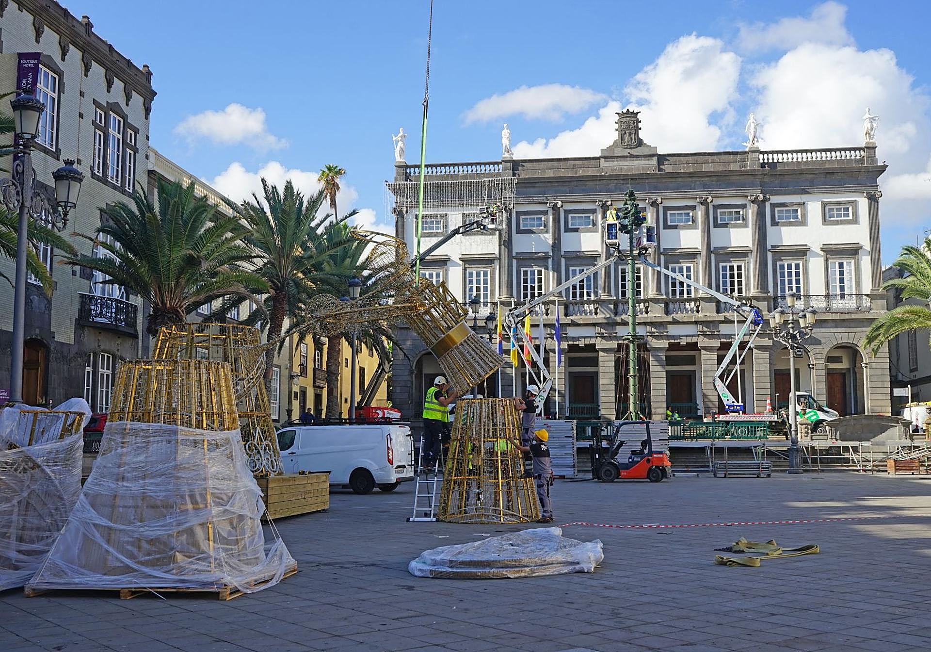 La alcaldesa de Las Palmas de Gran Canaria, Carolina Darias, junto al concejal de Seguridad, Josué Íñiguez, y el director artístico, Josué Quevedo, visitaron este lunes los trabajos de montaje de las luces y los elementos decorativos de las próximas navidades que engalanan la plaza de Santa Ana.