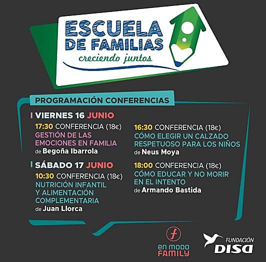 Con todo, la feria cuenta también con cuatro conferencias, acogidas por la Fundación DISA dentro de su proyecto Escuelas de Familia, para las cuales hay que adquirir una entrada aparte y cuyo coste es de 18 euros. La primera de ellas corre a cargo de la psicóloga Begoña Ibarrola, que hablará de la gestión de las emociones en familia el viernes 16 de junio a las 17:30 horas. El sábado 17 de junio a las 10:30 horas, el chef Juan Llorca ofrecerá su conferencia sobre nutrición infantil y alimentación complementaria; a las 16:30 horas la podóloga Neus Moya explicará cómo elegir un calzado respetuoso para los niños; y a las 18:00 horas el enfermero pediátrico Armando Bastida hablará de cómo educar y no morir en el intento.