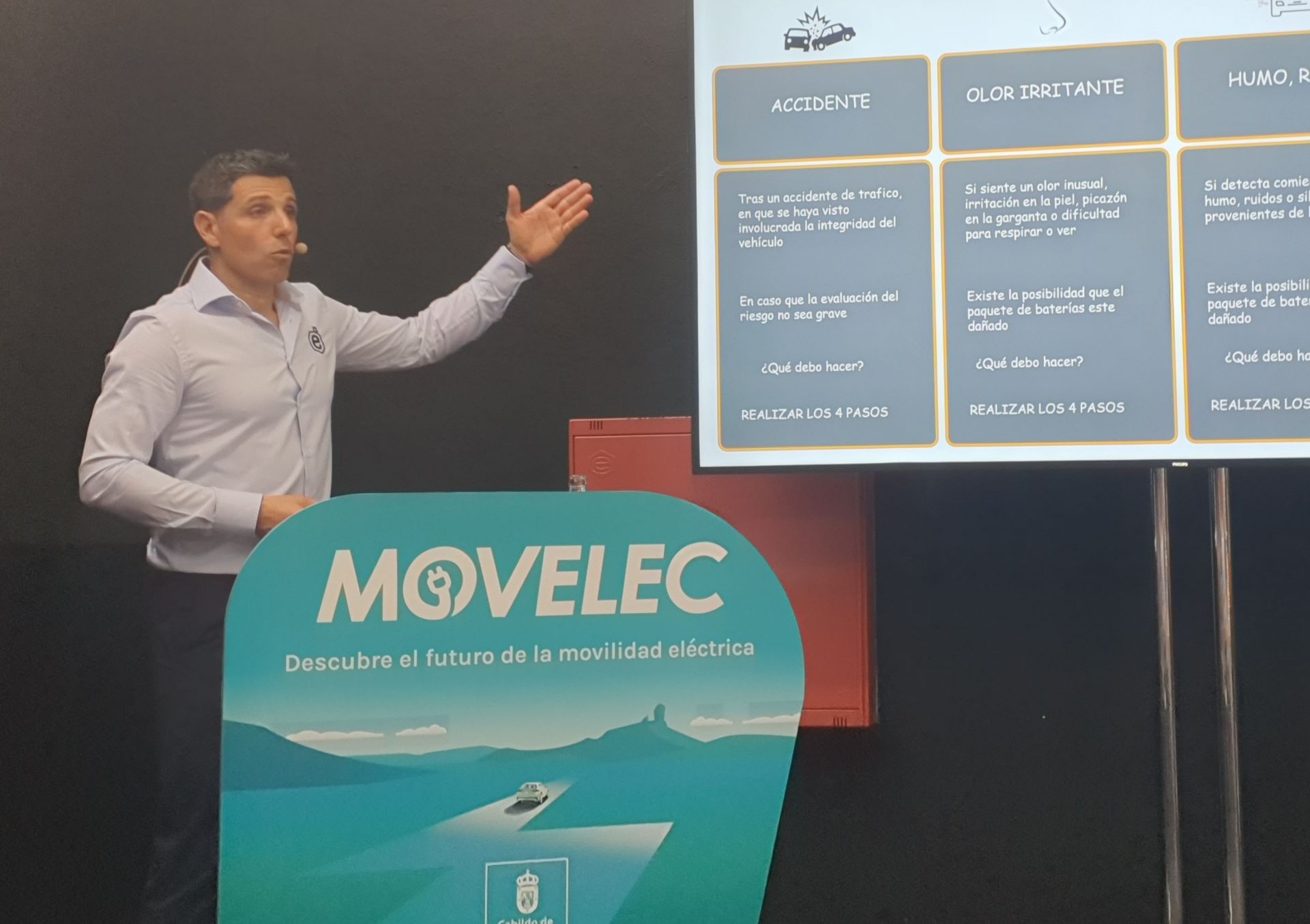 Durante la charla que ofreció en el Salón del Vehículo Eléctrico de Canarias Movelec, dirigida en esta ocasión a los usuarios para explicar las medidas de seguridad que minimizarán las incidencias, resaltó que el primer paso es familiarizarse con sus peculiaridades, pues no solo cambian las sensaciones, sino también el modo de conducción.