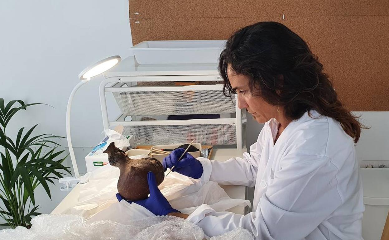 Las tareas de restauración, que corren a cargo de Cristina Ojeda Oliva, especialista en material arqueológico, conllevarán la eliminación de sales en la superficie exterior de la cerámica, así como la limpieza, consolidación y reposición puntual, para evitar su deterioro futuro. Cada paso del trabajo será debidamente documentado y se recogerá en una ficha de restauración, que acompañará a la pieza en su lugar de depósito definitivo.