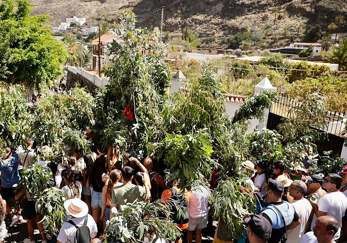 A las dos horas la banda Guayedra, a la altura del cruce con la calle Acequia del Moral, relevó a la de Guiniguada y dos horas después hizo lo propio la de Agaete. La rama bajaba despacio, mientras la multitud bailaba, brincaba y cantaba camino del pueblo y de la iglesia. 'Cielito Lindo' y su canta y no llores o 'Me gusta la bandera' fueron los hits de una marcha verde y aromática que terminó, ya empezada la tarde, a los pies de un San Pedro apenas visible entre ramas de Tamadaba.
