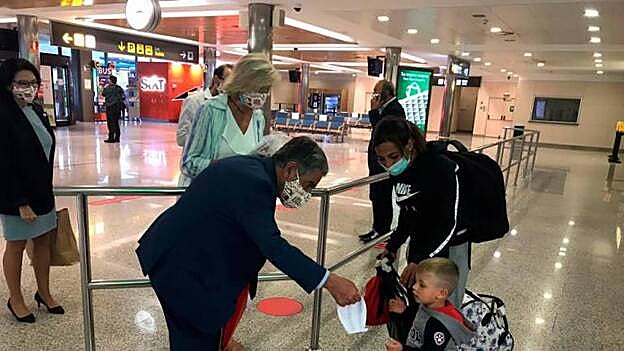 El presidente de Cantabria, Miguel Ángel Revilla, ha ido a recibir a los pasajeros, entregándoles mascarillas en el aeropuerto.