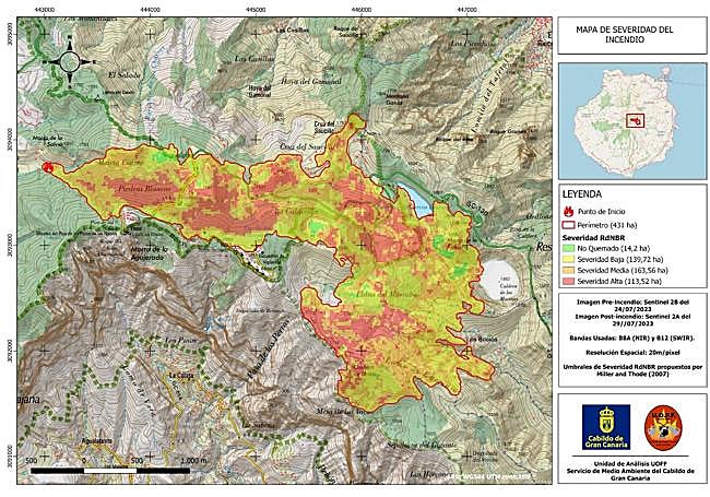 El jefe de Emergencias del Cabildo de Gran Canaria, Federico Grillo, explicó que las quemas prescritas fueron fundamentales para poder frenar el incendio y limitar su extensión. «En los Altos de Pozo, una zona muy tratada con fuego técnico, se aprecia claramente como la cabeza del incendio se frena muchísimo y eso impide que el fuego avance hacia la zona de Camaretas, la zona alta de San Mateo e incluso Valsequillo», aseguró. Sin estas zonas que actuaron de cortafuegos, el potencial del incendio era de unas 3.000 hectáreas hacia el norte y unas 8.000 hacia el sur. «En toda la zona afectada por el incendio se puede apreciar con claridad la diferencia entre las zonas tratadas con fuego técnico y las no tratadas», concluyó.