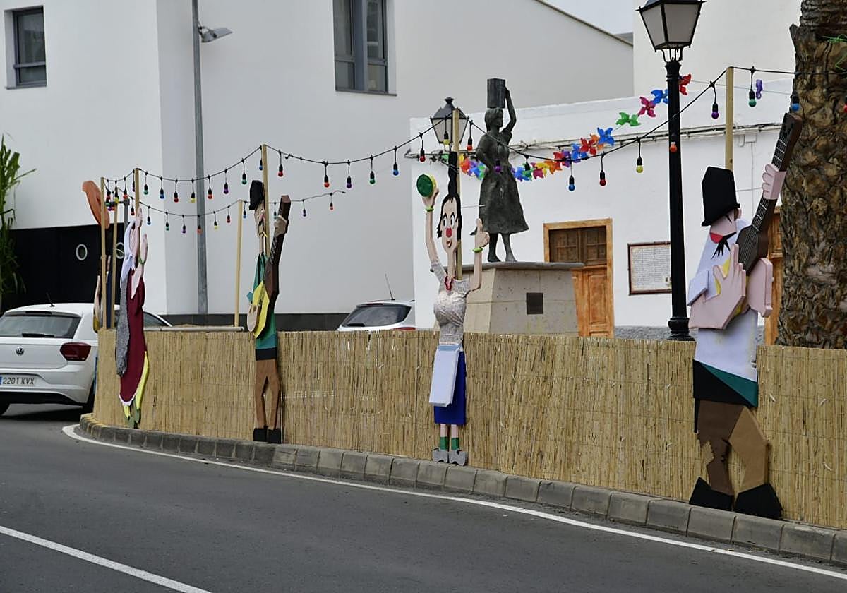 Francisco Hernández, presidente de la Asociación de Romeros Casa del Mato, explica que en este mural se han querido reflejar algunos de los oficios y también rincones con mayor arraigo en El Tablero y que para ese fin se recurrió a personajes caracterizados con una estética costumbrista similar a la del mítico Cho Juaá que creara y popularizara el artista Eduardo Millares Sall. «Hemos recreado un coche de hora, un bar del pueblo, un pilar o la turronera», subraya con orgullo.