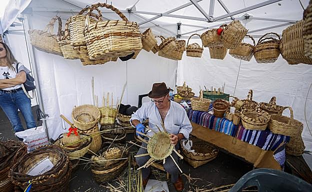 En el puesto de al lado tenía a don Pablo, un moyense al que dieron un espacio en el que enseñó y vendió algunas de sus cestas hechas a mano. Muchas de ellas formadas con mimbre, algunas con junco y otras con caña. Un arte que aprendió hace más de 40 años y que en esta jornada matinal mostró a quienes se acercaron a su pequeño puesto en la plaza de San Juan.