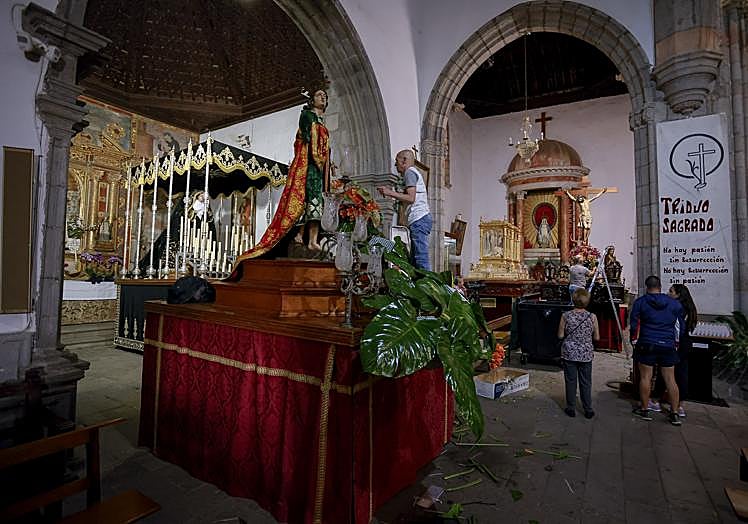 Durante la mañana y la noche de este jueves los miembros de la iglesia de San Juan junto a un equipo de colaboradores de la parroquia, todos ellos coordinados por el reconocido diseñador teldense Segundo Amador, invirtieron su tiempo para engalanar las veneradas imágenes que intervendrán la magna procesión que caminará durante la puesta de sol de este Viernes Santo por las calles del casco histórico de Telde.