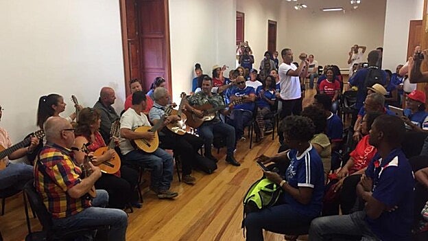 Los 48 integrantes de Caminheiros Sem Fronteiras –procedentes de las islas de Santiago, Santo Antão, Boavista, Fogo, São Nicolau, Maio, São Vicente, Sal, Brava y Santa Luzia- recorren estos días junto al colectivo Turcón-Ecologistas en Acción parajes y lugares simbólicos de Gran Canaria y han incluido el municipio de Telde en su visita aprovechando esta ruta que parte de la Casa Condal, donde fueron recibidos por la concejala de Cultura, Marta Hernández, en nombre de la edil de Turismo, Celeste López, y el grupo de profesores de la Escuela Municipal de Música, y visitaron el taller de artesanía.
