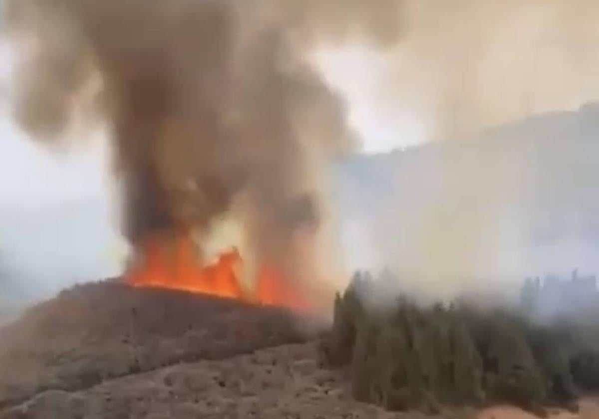 Las imágenes muestran desde un helicóptero el foco secundario del incendio de Tejeda, situado en una zona cercana a varias viviendas. En concreto, se trata de una línea de fuego bastante intensa en los alrededores de la presa de Cuevas Blancas, un núcleo que ha sido desalojado por las autoridades.
