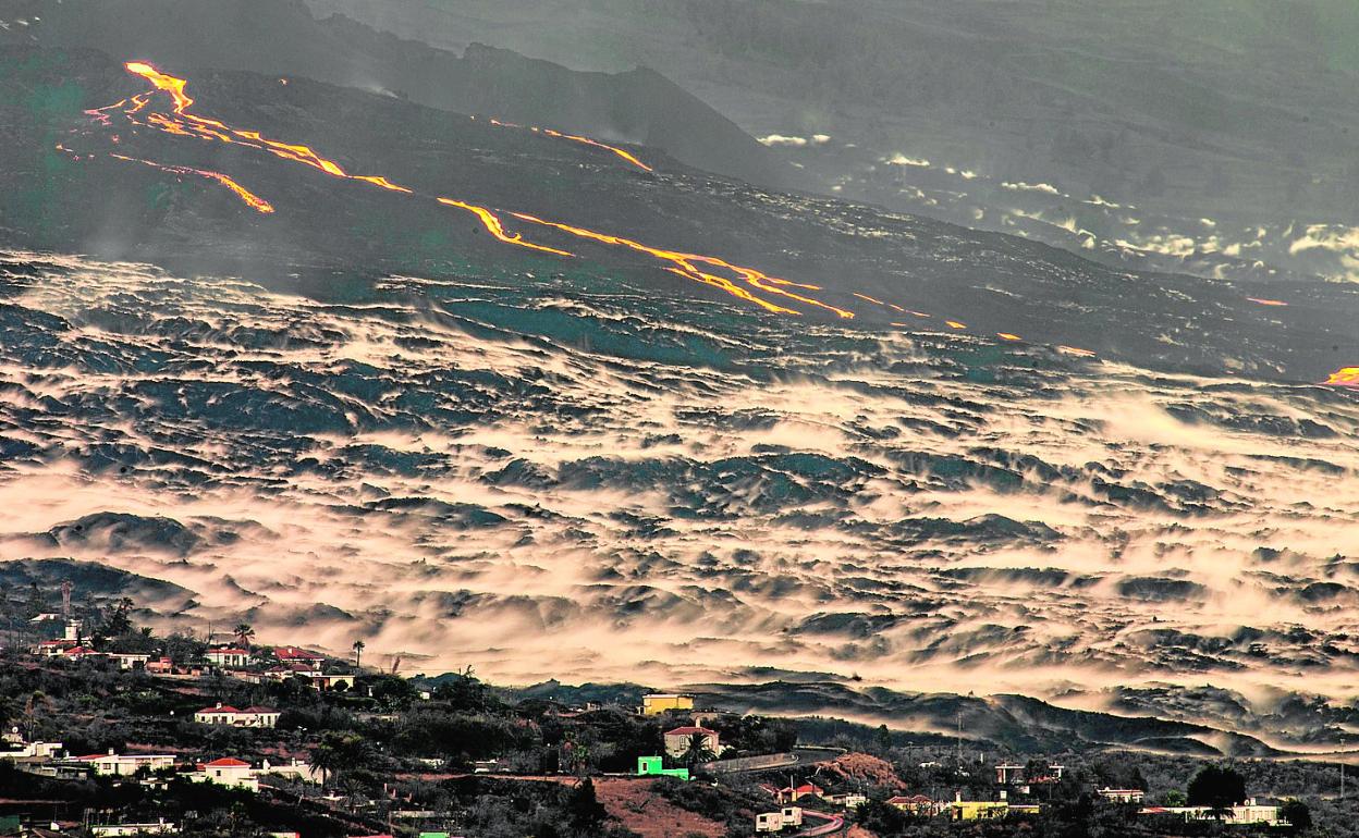 Tras varios días lanzando gran cantidad de cenizas, el volcán palmero se ha vuelto más efusivo y emite mucha más lava. Este aumento del material magmático se apreció en la noche del jueves con un desborde del lago de lava que produjo una auténtica cascada incandescente. «A partir de ese momento se incrementó la tasa de emisión de lava, muy fluida», lo que ha ocasionado que crezca el caudal de las coladas que fluyen ladera abajo desde Cabeza de Vaca, explicó ayer Carmen López, portavoz del comité científico en del Plan Especial de Protección Civil y Atención de Emergencias por Riesgo Volcánico de Canarias (Pevolca).