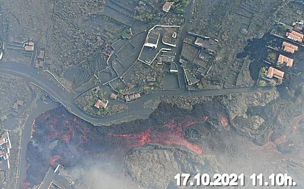 17 de octubre. El frente de la colada más activa rebasa la montaña de La Laguna por el sur y camina a 15 metros por hora hacia el mar, con temperaturas de 1.270 grados. Le faltan 200 metros para llegar a los acantilados. Al caer la tarde, la actividad en el cono principal se intensifica y grandes coladas de lava se precipitan hacia el norte.