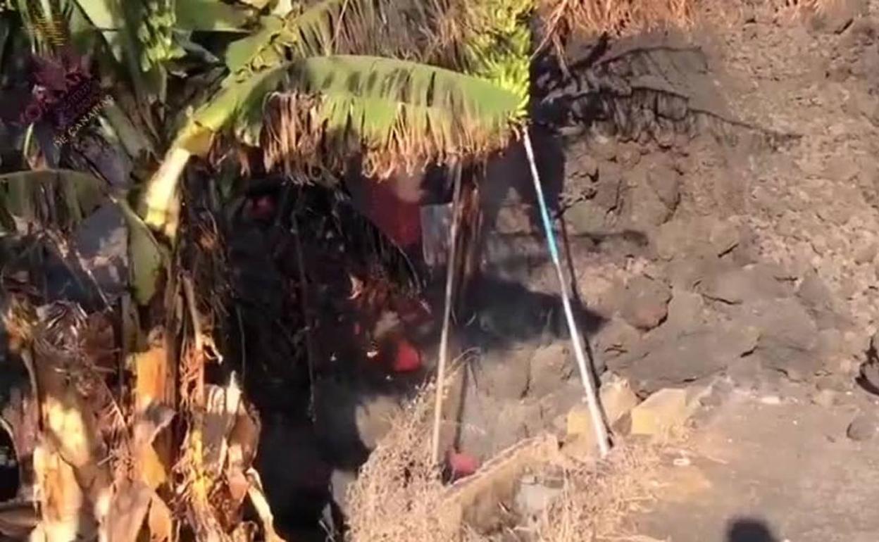 Imágenes grabadas este lunes por miembros del Involcan del avance de la colada de lava en el interior de una platanera