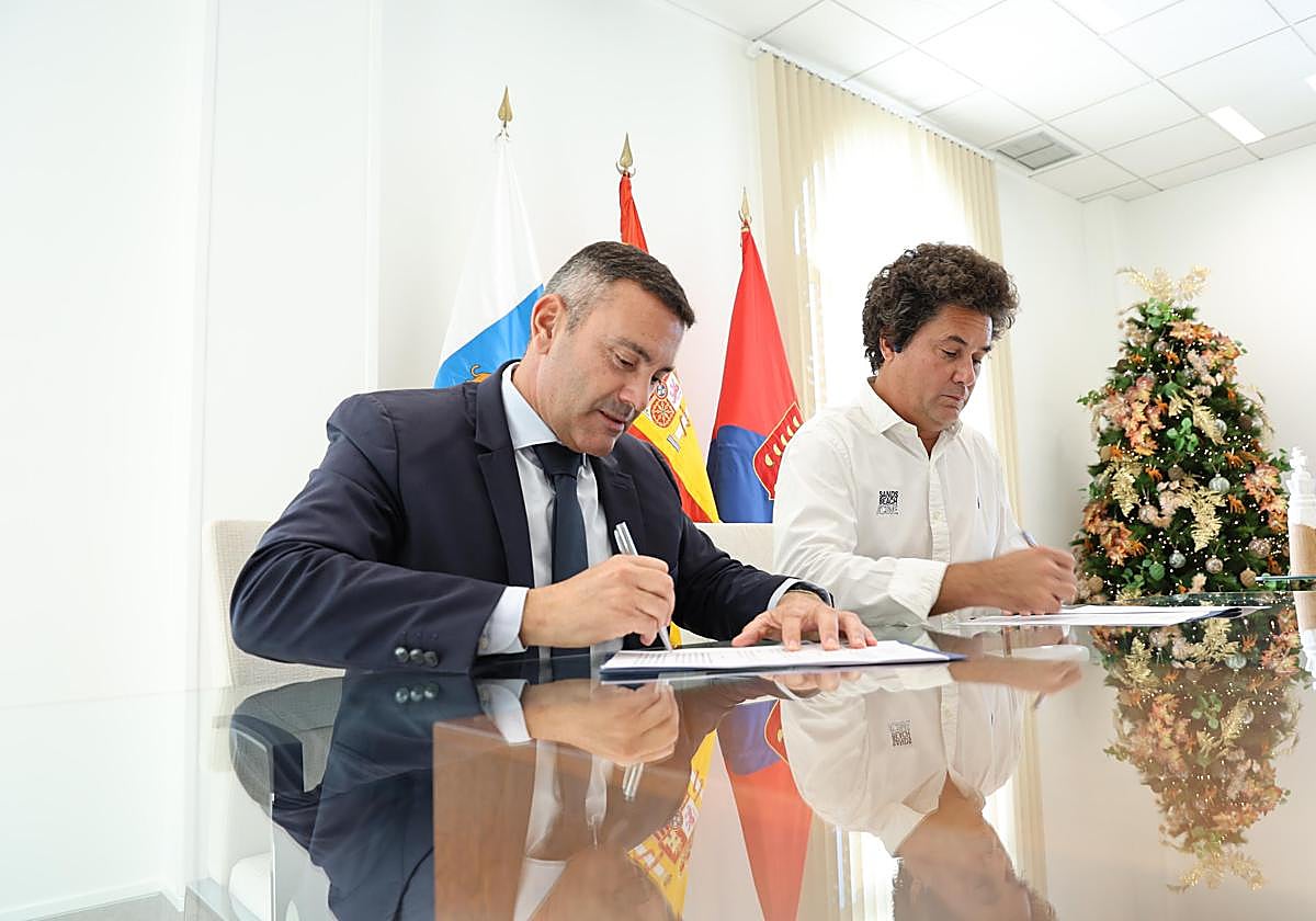 El presidente del Cabildo, Oswaldo Betancort, y el presidente de la entidad rojilla, Juan Carlos Albuixech, cuyo primer equipo milita un año más en la Tercera Federación, formalizaron el acuerdo este pasado lunes en la sede de la primera Corporación.