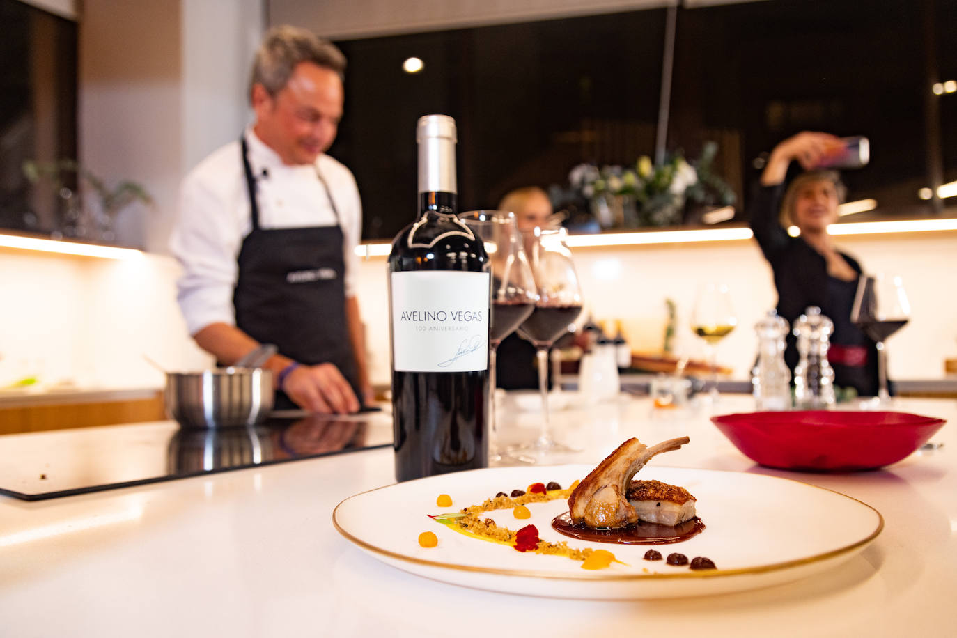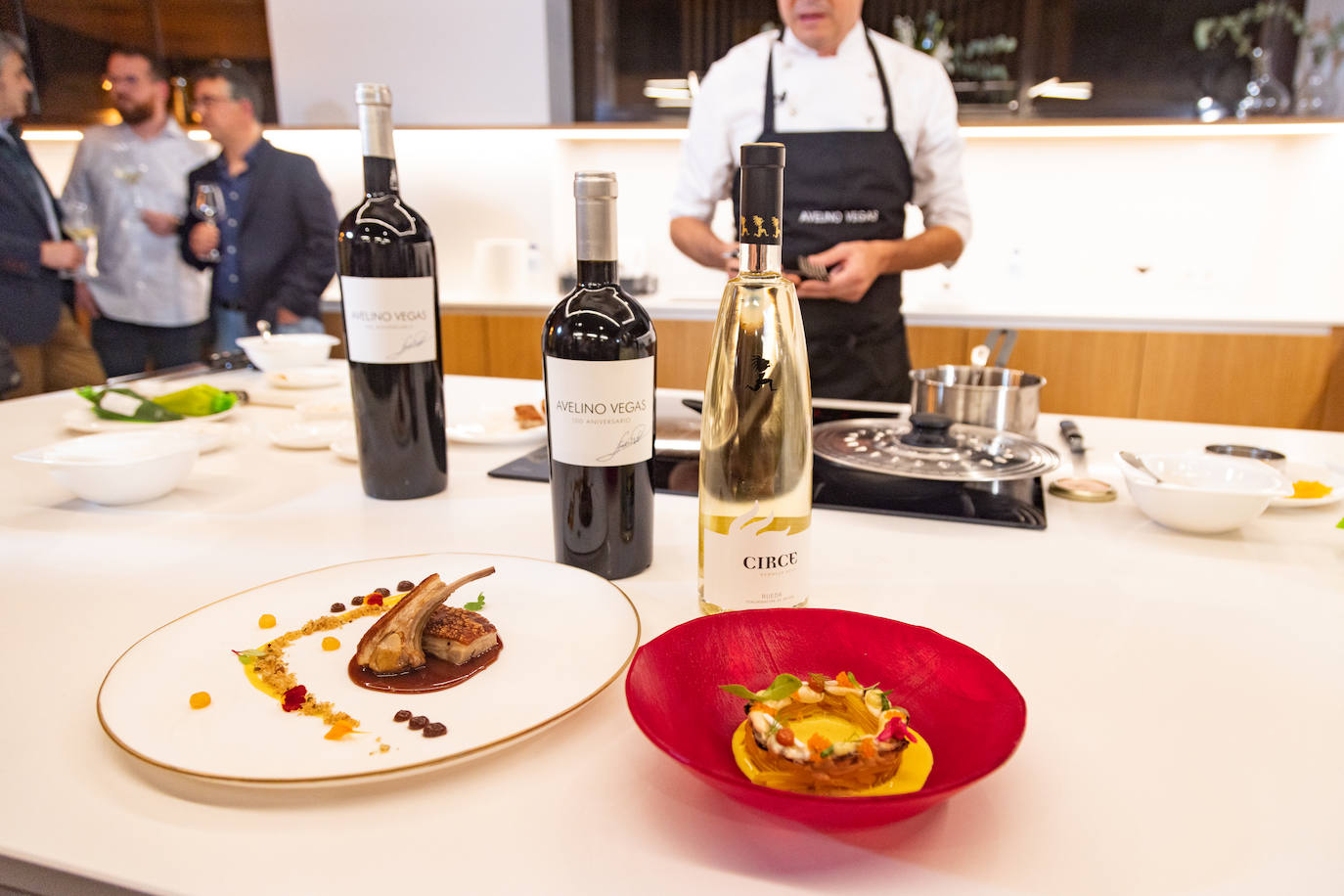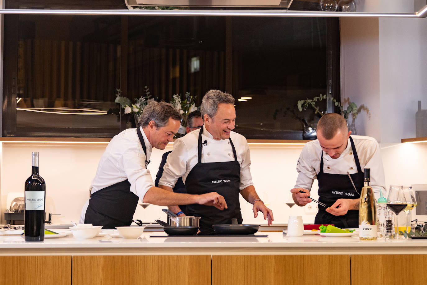 Los más de medio centenar de invitados disfrutaron de ver cómo cocinaban los hermanos Torres en directo dos platos que armonizaban a la perfección con sendos vinos de Bodegas Avelino Vegas.