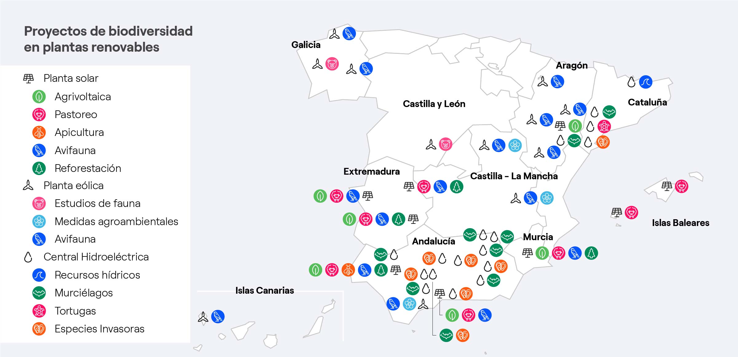 Galicia, Castilla y León, Aragón, Cataluña, Murcia, Castilla-La Mancha, Extremadura, Andalucía e Islas Canarias, son las comunidades autónomas en las que Endesa ha desplegado su actividad de protección de la biodiversidad, acciones que se seguirán extendiendo por las 280 instalaciones renovables que la compañía tiene en toda España. Unas plantas que producen energía limpia y, desde hace un siglo en algunos casos, se han convertido también en un refugio para la biodiversidad.