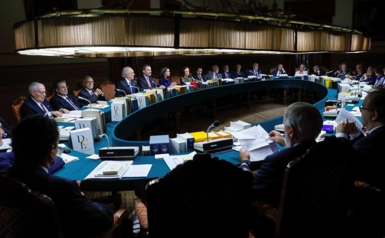 Pleno de la RAE presidido por los reyes Felipe y Letizia en 2019. EMILIO NARANJO