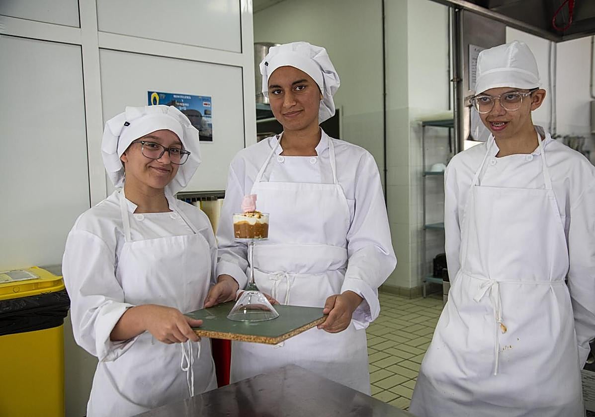 El pasado miércoles, Cristina Suárez Cruz y Ainhoa Santana Montaño y Francisco Jesús Mejías Gil, que llevan apenas cuatro meses como alumnos en el Cifp San Cristóbal, ultimaban el postre que han elaborado a partir de la obra seleccionada de Nadia Brito. «Plasmamos nuestros sentimientos», explican nerviosos sobre el mes y medio de trabajo previo. «El postre se cimenta en la galleta, como recuerdo de nuestra casa. Posteriormente, le hemos añadido varias capas. En la primera, está el dulce de leche con un toque salado, que significa la vida; la segunda refleja los sueños de ahora, que plasmamos con los suspiros; la nata montada es la tranquilidad; y los cambios de la vida los mostramos con el crujiente de millo que nos lleva a nuestra tierra con un sabor a gofio pero con una textura que refleja una vida que cambia a medida que pasa el tiempo. Por último, el algodón azúcar, que corona el postre, refleja los sueños del futuro», apunta Cristina Suárez Cruz.