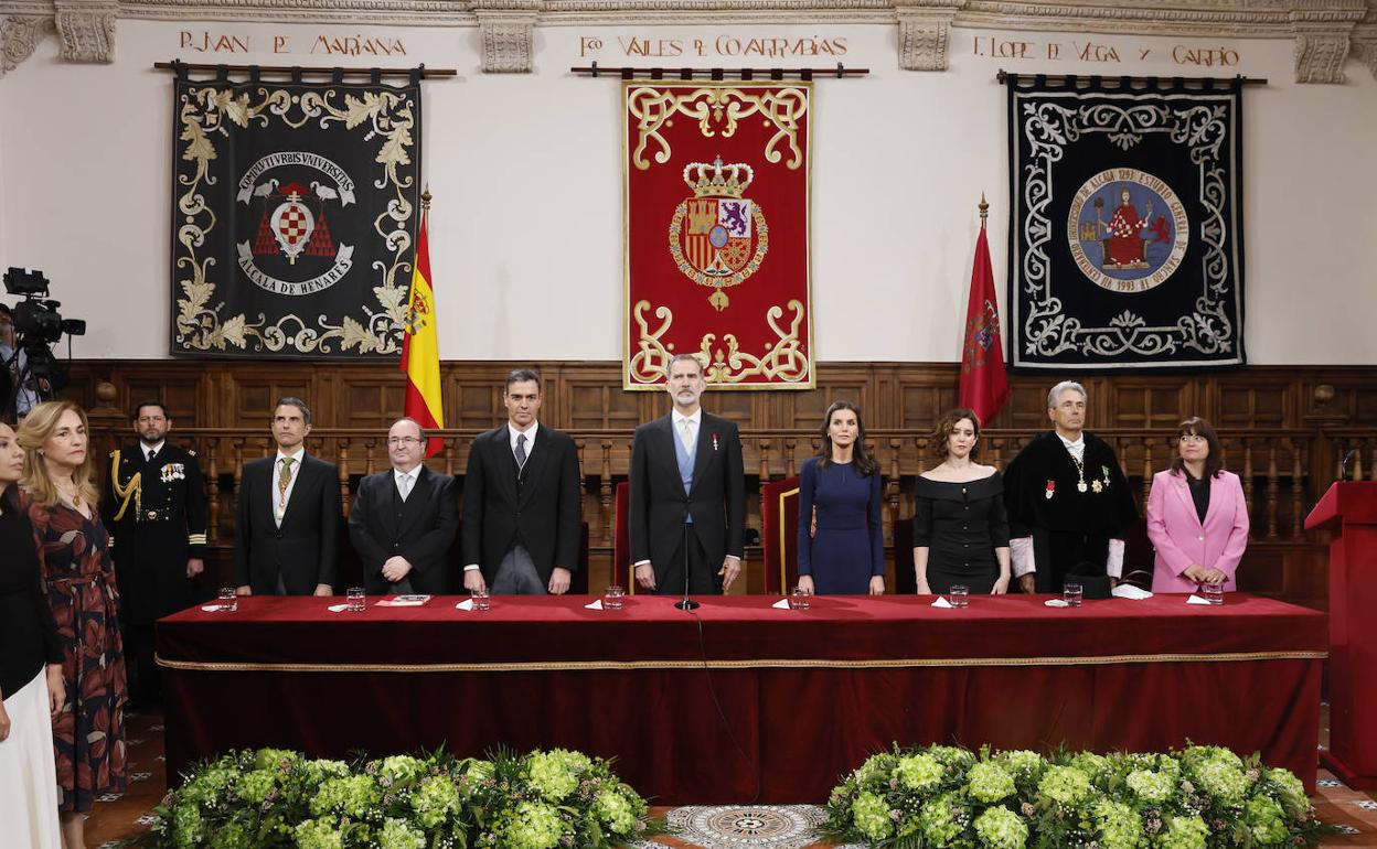 La solemne ceremonia de entrega del Premio Cervantes volvió este viernes al centenario Paraninfo de la Universidad de Alcalá tras dos años de ausencia forzada por la pandemia. Pero faltó su ganadora. La «insumisa» Cristina Peri Rossi fue la gran ausente en al acto de entrega del más alto galardón de las letras hispanas, presidido por los reyes, Felipe y Letizia, y ante el presidente del Gobierno, Pedro Sánchez, y el ministro de Cultura, Miquel Iceta, y que se convirtió en un clamoroso canto por la paz. «Podría escribir los versos más agradecidos esta noche, y cumpliría con mi obligación de escriba, aunque los versos no salvarían a los que mueren por las bombas y los misiles en la culta Europa», decía el discurso de la ganadora.