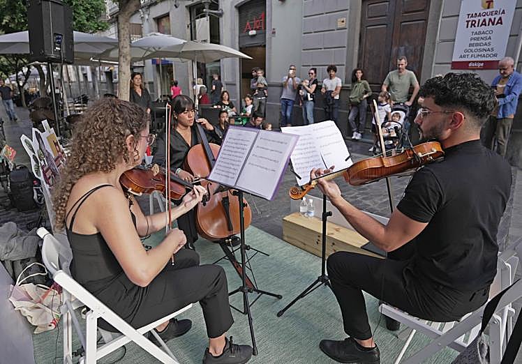 Un trío formado por dos violines y un violonchelo nos sorprende con su música a la salida de nuestras compras. En plena plaza Cairasco un grupo de transeúntes se para a reír a carcajadas con las piezas de micro teatro que Sala Bruta ha hecho saltar del escenario a la calle. Y si caminamos un poco más, podemos incluso aprender los mejores trucos para peinarnos en casa con profesionales de estética. Triana respira cultura y ocio con el arranque de su programa «Triana, una semana a cielo abierto».