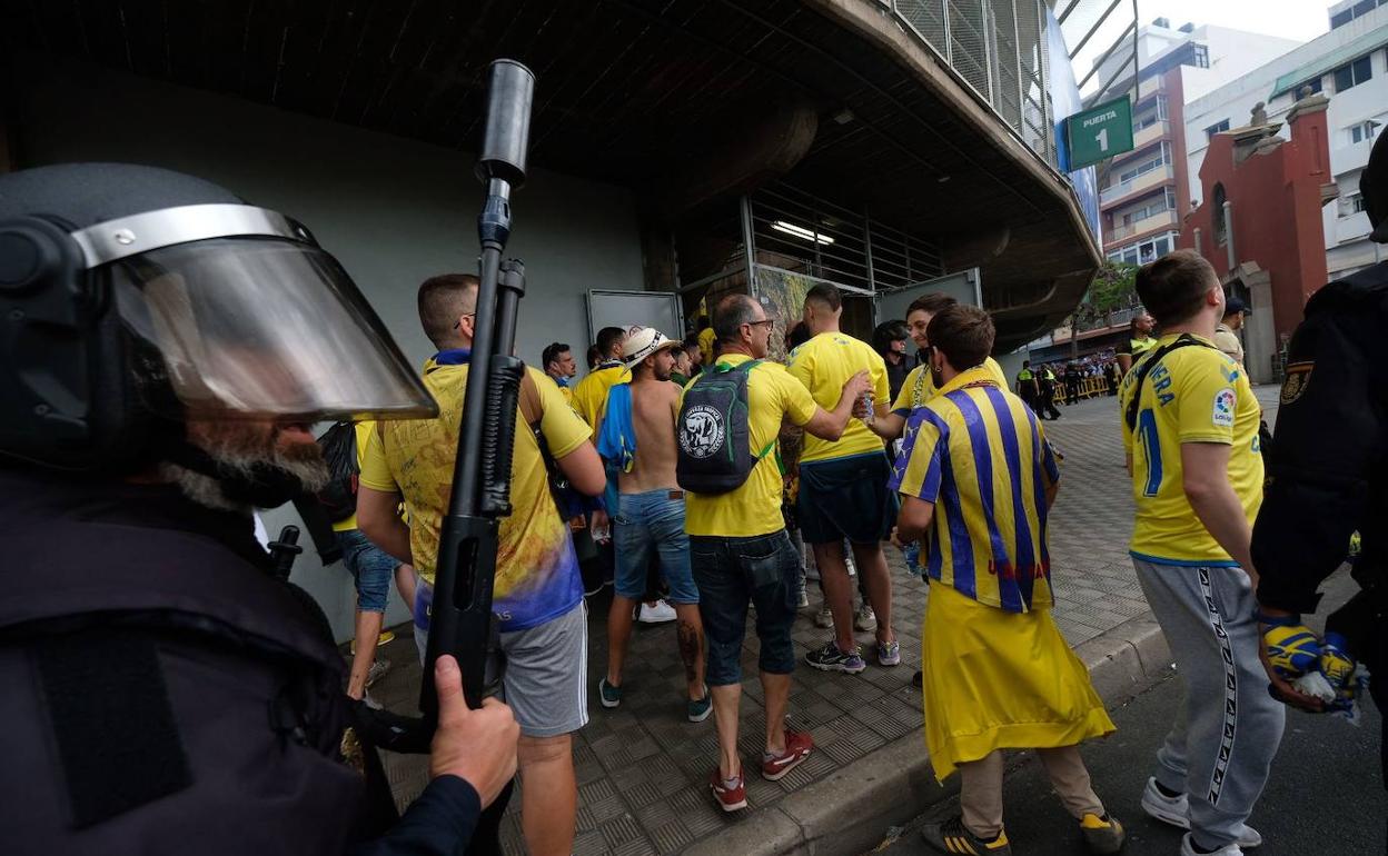 Tanto el Club Deportivo Tenerife como la Unión Deportiva Las Palmas se juegan hoy la primera parte que les posibilitará ascender a Primera División. Esta jornada está catalogada como de alto riesgo, por ello las medidas de seguridad son extremas.