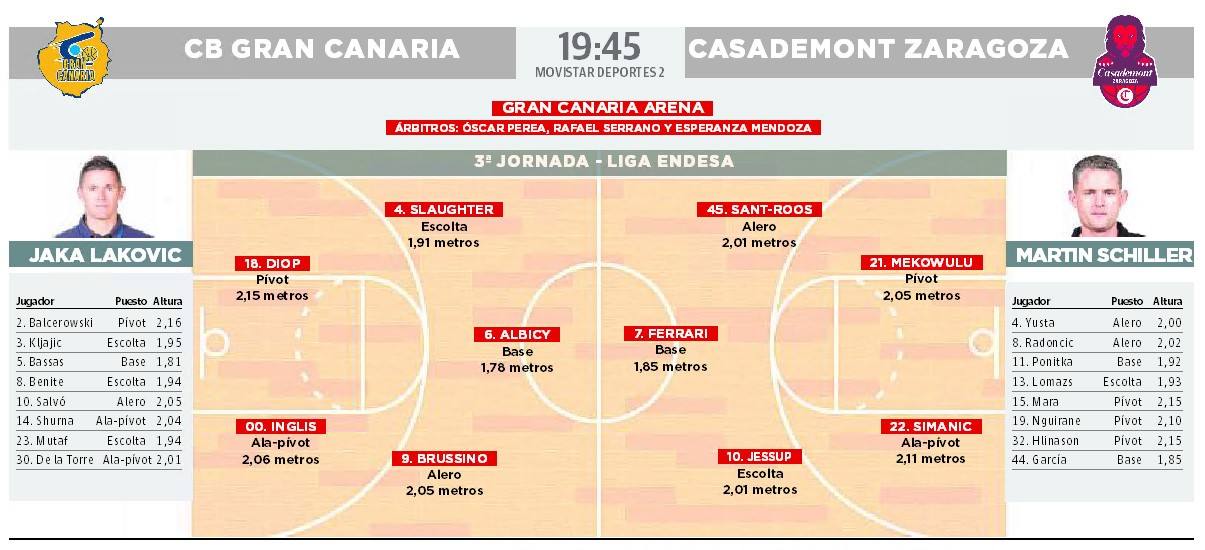 La ley del Gran Canaria Arena. Unidad y ambición para defender el fortín. Tras conseguirlo ante el trasatlántico Barça en el descorche de la fase regular de la Liga Endesa, el Club Baloncesto Gran Canaria recibe este sábado, a partir de las 19.45 horas (Movistar Deportes 2 -dial 60-), al Casademont Zaragoza sin confianzas por medirse al colista y con el propósito de multiplicar sus prestaciones ante el cobijo de la afición.