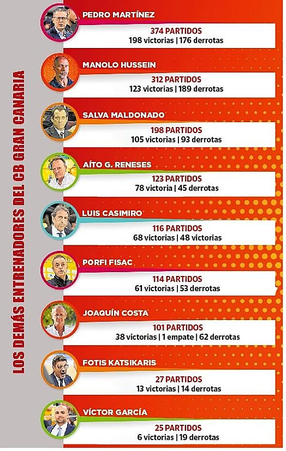 En la actualidad, el también catalán Pedro Martínez lidera gran parte de los apartados que puede presumir el inquilino del banquillo grancanario. Contempla 374 encuentros en la suma de todas las competiciones (ACB, Copa, Supercopa, Copa ULEB, EuroCup y Euroliga), superando así a Manolo Hussein (312), Salva Maldonado (198), Jaka Lakovic (175), Aíto García Reneses (123) y Luis Casimiro, artífice este último de la Supercopa conquistada en 2016, el otro gran título que presume la entidad.