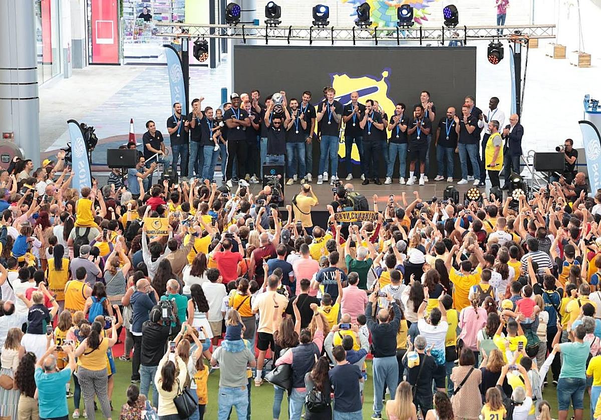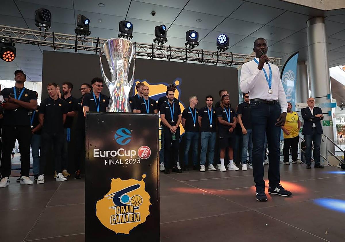 Cientos de aficionados festejan con el Club Baloncesto Gran Canaria la obtención del primer título europeo de su historia. La afición agasaja en el Centro Comercial Los Alisios al club claretiano tras conquistar ayer en el Gran Canaria Arena y ante más de 9.500 personas la EuroCup. Los de Lakovic ganaron al Turk Telekom turco (71-67) en un encuentro vibrante.