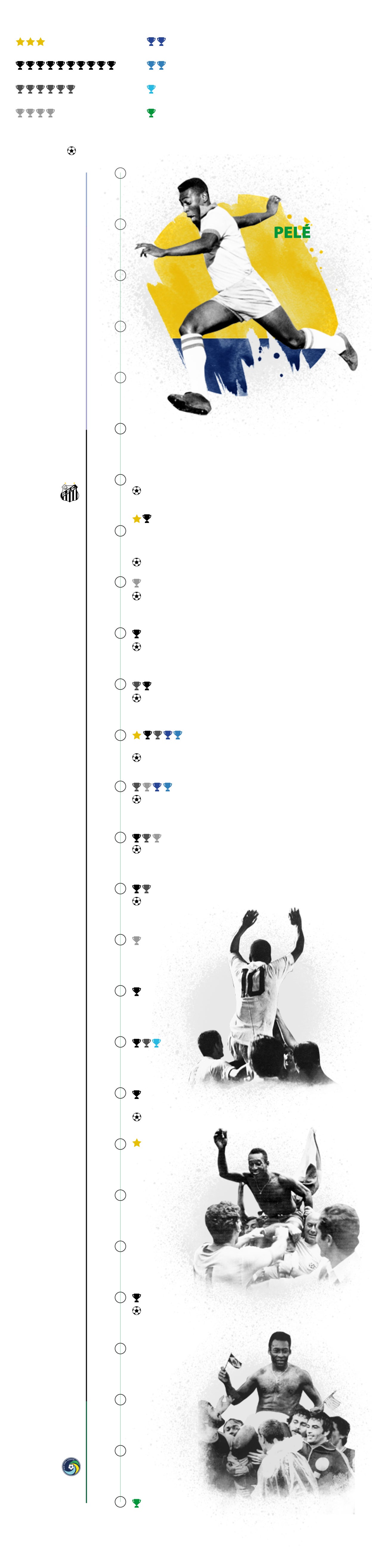 El Santos fue el club de su vida, el equipo al que llegó con 15 años y en cuyas filas deslumbró al mundo durante casi dos decenios. Pero una serie de negocios ruinosos hizo que tuviese que pasar los últimos años de su carrera deportiva en el New York Cosmos, donde añadió glamur a su epopeya.