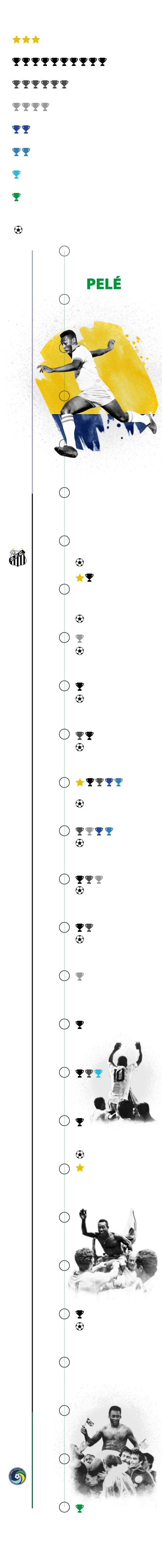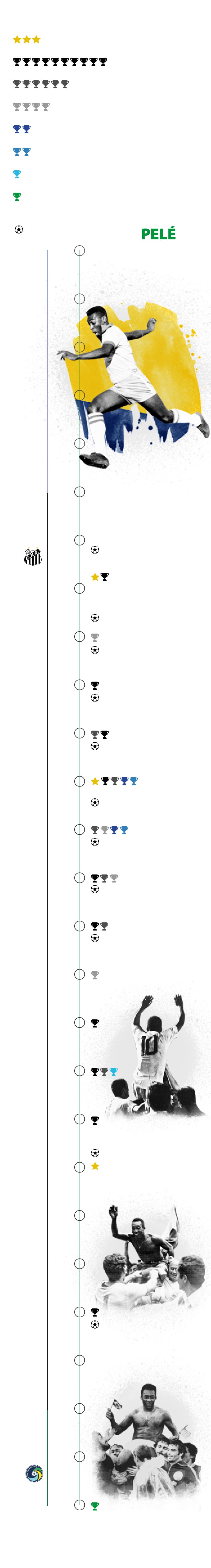Pelé fue una estrella precoz y supo mantenerse en la cima durante dos décadas. A los 15 años llegó al Santos, el club al que dedicó el grueso de su trayectoria. A los 16 ya era una celebridad en Brasil y con 17 asombró al orbe liderando a la verdeamarela en el Mundial de Suecia. Solo era el inicio de lo que estaba por venir.