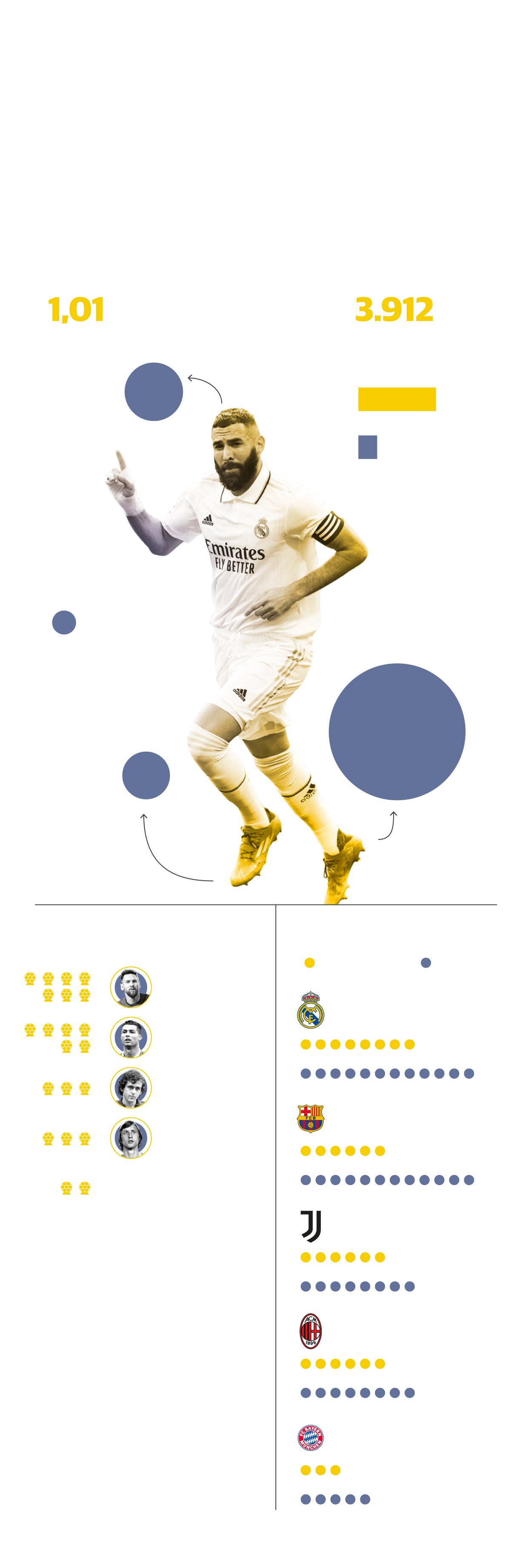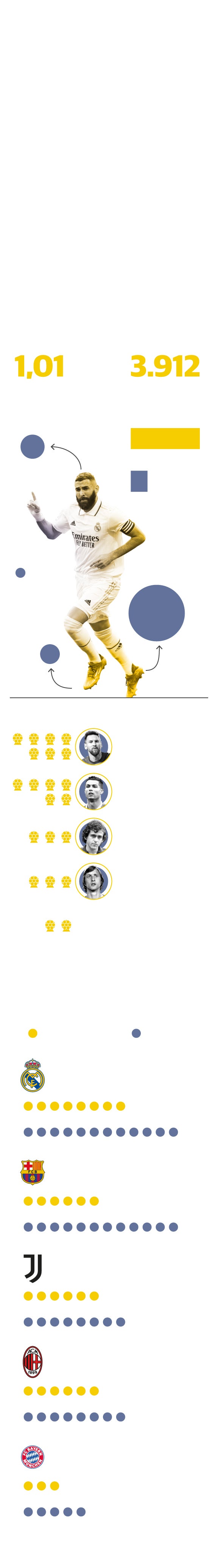 El trono del atacante rosarino pasa ahora a manos de Benzema, profeta en su tierra que sigue los pasos de otros franceses como el mencionado Kopa (laureado con el Balón de Oro en 1958 y componente de aquel Real Madrid que alzó cinco Copas de Europa de forma consecutiva), Michel Platini (triple ganador en 1983, 1984 y 1985, cuando era el jugador bandera de la Juventus y de la Francia dueña de la Eurocopa de la que fue anfitriona), Jean-Pierre Papin (vencedor en 1991 como estrella de aquel Olympique de Marsella que se proclamó subcampeón de Europa) y Zinedine Zidane (coronado en 1998 tras ganar el Mundial de ese año con la selección francesa y entonces figura de la Juventus). El jugador cuyas habilidades para la caza asemejó José Mourinho a las de un gato es el nuevo 'minino de oro' del fútbol.